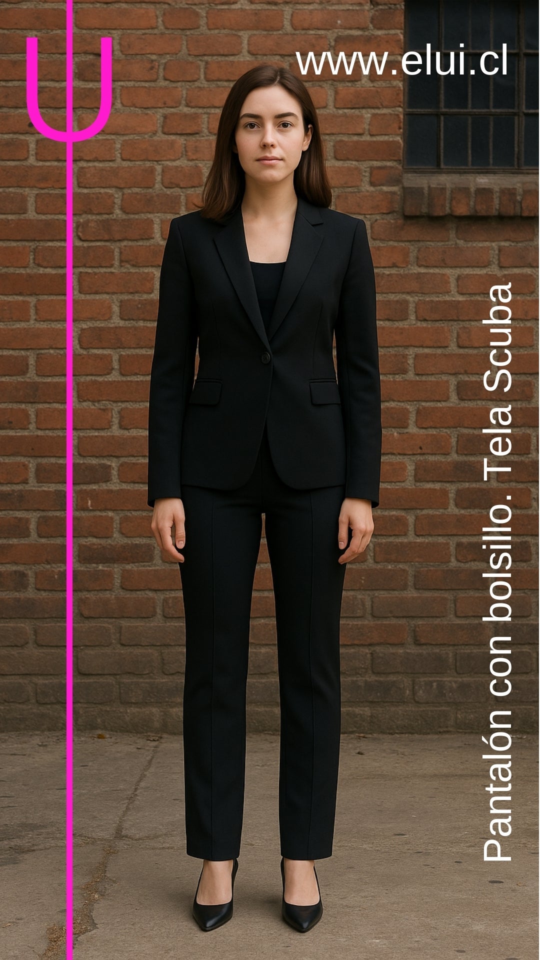 Pantalón de tela de vestir, con costura frontal que estiliza la figura. Bolsillos y pretina alta.